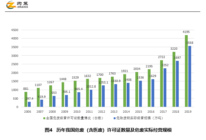 我國危廢處理行業(yè)的經(jīng)營規(guī)模在逐年增長,據(jù)《年報》,截至2019年底,全國危險廢物許可證持證單位共4195個,同比增長30.3%。其核準收集和利用處置能力達到12896萬噸/年(含單獨收集能力1826萬噸/年);2019年度實際收集和利用處置量為3558萬噸(含單獨收集81萬噸)。與2006年相比,2019年危險廢物持證單位核準收集和利用處置能力、危險廢物實際收集和利用處置量分別增長1709%和1098%。