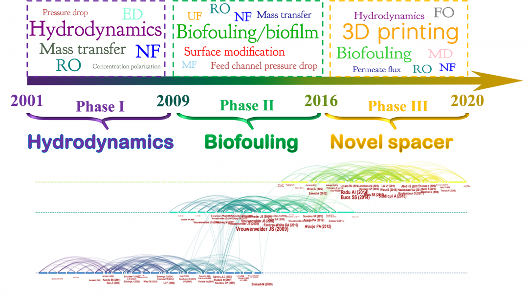 對Web of Science獲取的主題為“ feed spacer”和“ membrane”、時間跨度為2001——2020年的文獻進行文獻計量學分析,可以發(fā)現(xiàn)在過去的20年里,該領(lǐng)域的文章和專利發(fā)表的數(shù)量均呈上升趨勢(圖2A和B)。在早期,產(chǎn)業(yè)界更早意識到進水隔網(wǎng)對膜元件性能的重要影響,申請了一些相關(guān)專利。隨后,學術(shù)界也針對進水隔網(wǎng)開展了更多的研究,尤其是2009年以來取得了快速的發(fā)展。在涉及的膜工藝中,針對高壓驅(qū)動膜(RO和NF)的研究所占比例最大,膜蒸餾(MD)、電滲析(ED)和正滲透(FO)近年來也受到了較多的關(guān)注(圖2C)。該領(lǐng)域的發(fā)文國家主要集中在荷蘭、沙特阿拉伯和美國,且三國之間呈現(xiàn)出密切的合作關(guān)系(圖2D)。對所有文獻的關(guān)鍵詞進行聚類分析和詞頻統(tǒng)計,發(fā)現(xiàn)過去20年的研究可以分為三個發(fā)展階段(圖3)。在第一階段(2001——2008年),研究者主要關(guān)注進水隔網(wǎng)的水力學性能(如傳質(zhì)和壓降)。在2009年,Johannes Vrouwenvelder等在Water Research上發(fā)表了一篇經(jīng)典的、具有分水嶺意義的文章,指出進水隔網(wǎng)和流道對于膜元件中生物污染的發(fā)生起到了至關(guān)重要的作用。此后的第二階段(2009——2015年),對于進水隔網(wǎng)的研究快速發(fā)展,并且研究重點集中在生物污染上。在第三階段(2016——2020年),由于高精度3D打印技術(shù)的不斷成熟,越來越多研究者開始進行新型進水隔網(wǎng)的設(shè)計與開發(fā),以提升膜元件的水力學性能和抗污染性能。