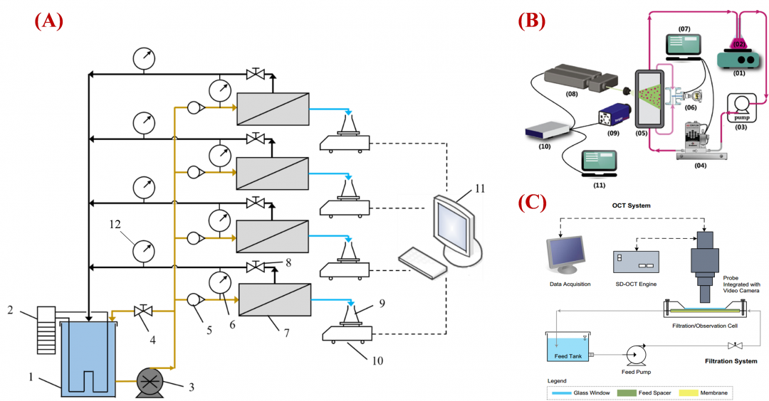 圖4 (A)錯流過濾裝置(Lin et al.,2020);(B)顆粒成像測速(PIV)系統(tǒng)(Haidari et al.,2016);(C)光學相干斷層掃描(OCT)系統(tǒng)(Gao et al.,2013)。