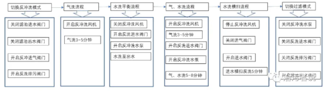 常規(guī)的濾池反沖洗是通過布置在濾料下方的反沖洗配氣配水廊道內(nèi)送入壓縮空氣和清水池的濾后水來進行的,以采用彗星濾料的D型濾池來說,一般的流程是:1、切換反沖洗模式。2、氣洗流程。3、氣水洗流程。4、水洗加橫掃流程。5、切換過濾模式。詳細的操作流程見下圖。