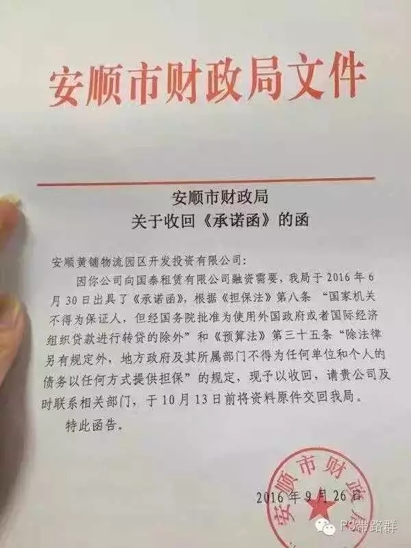 2016年10月10日—11日,貴州安順、遵義等地,要將向金融機構(gòu)(主要是融資租賃、信托)提供的為融資提供支持的“承諾函”、“安排函”撤回。此消息一出,在金融機構(gòu)和PPP界掀起軒然大波:“沒有了‘承諾函’,政府融資的業(yè)務(wù)還做不做了?”“整個社會信用在這一刻瞬間崩塌”……