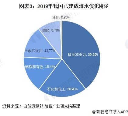 目前我國海水淡化主要用途為核電和電力領(lǐng)域,占我國海水淡化總量的39.39%,其次是石化和化工占海水淡化總量的20.90%,鋼鐵和有色占海水淡化總量的15.44%。與廣大人民群眾息息相關(guān)的市政和飲用水占海水淡化總量的13.77%。
