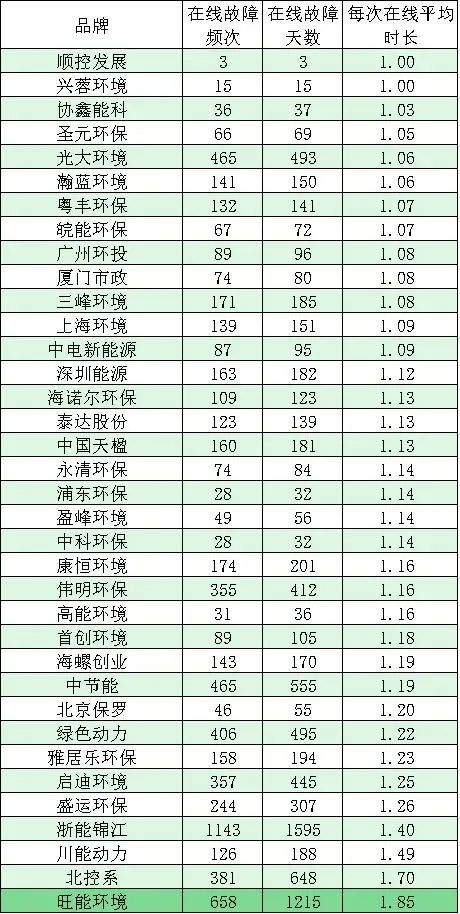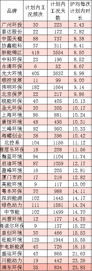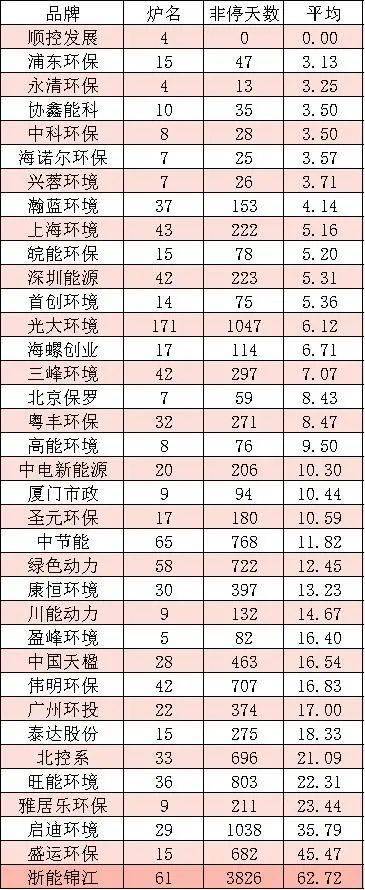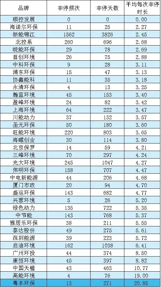 數據顯示,順控發(fā)展、粵豐環(huán)保、高能環(huán)境、興蓉環(huán)境、深能環(huán)保等五家品牌企業(yè),旗下每臺焚燒爐的非停頻次平均都小于1。
