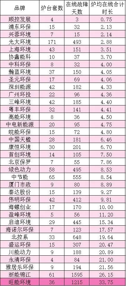 此榜單主要是衡量不同品牌旗下焚燒爐,每次非計劃停爐的平均時長,主要是與衡量故障大小狀況有關,如果導致非停的故障較大,就必然要延長檢修時間。