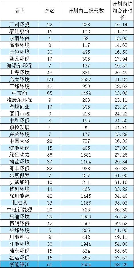 康恒環(huán)境、浦東環(huán)保、深圳能源、廣州環(huán)投、上海環(huán)境、瀚藍環(huán)境、中節(jié)能、光大環(huán)境、三峰環(huán)境、中科環(huán)保、海螺創(chuàng)業(yè)、首創(chuàng)環(huán)境等12家國內垃圾焚燒頭部和知名企業(yè),平均爐均總停爐頻次則小于或等于4次。
