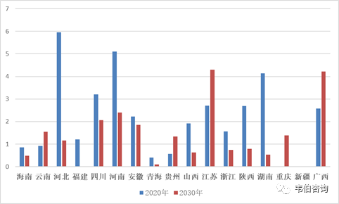 圖表15:截止2020年底和2030年底各省垃圾焚燒中長(zhǎng)期規(guī)劃新增項(xiàng)目產(chǎn)能(萬(wàn)噸/日)
