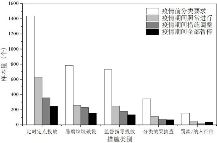 疫情期間生活垃圾分類體系的響應(yīng)主要表現(xiàn)在調(diào)停分類措施與新增防疫措施兩方面。55.3%已開展分類社區(qū)做出分類調(diào)停改變,其中16.6%暫停了全部垃圾分類工作,措施調(diào)整則以暫停易腐垃圾破袋(59.8%)、撤除督導(dǎo)人員(56%)等人工依賴性高措施為主。85.5%社區(qū)新增防疫相關(guān)分類措施,新增措施以增設(shè)口罩專用收集桶(54.0%)、收集箱集中定點(diǎn)消殺(34.2%)為主,社區(qū)調(diào)整與新增措施比例及程度隨疫情風(fēng)險(xiǎn)增高而加大。疫情驗(yàn)證了定時(shí)定點(diǎn)模式推廣可行性,凸顯智能化分類模式在無人監(jiān)管、無接觸條件下維持分類監(jiān)管力度、保障分類質(zhì)量的巨大優(yōu)勢,應(yīng)進(jìn)一步挖掘智能化分類模式應(yīng)用潛能。
