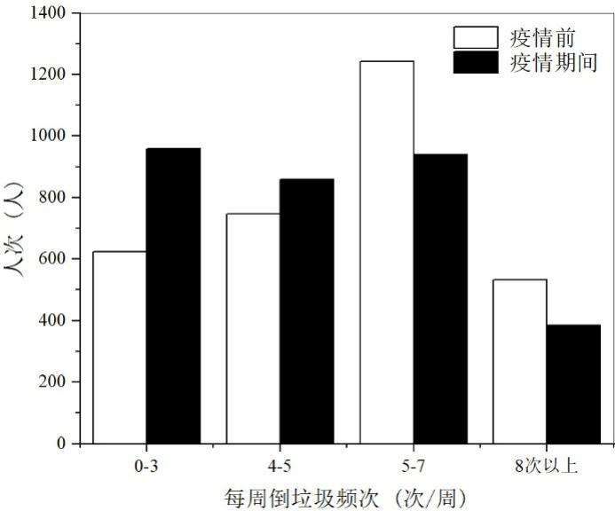 疫情導(dǎo)致社區(qū)垃圾分類基礎(chǔ)成分產(chǎn)生明顯變化,廢棄口罩大量增加,居民投放垃圾頻次顯著降低。疫情期間,人均廢棄口罩產(chǎn)生頻次約為3.7個(gè)/周,將近一半(48.2%)被調(diào)查者平均每周產(chǎn)生廢棄口罩?jǐn)?shù)量在0~3個(gè)范圍;30.6%居民投放垃圾頻率降低,由疫情前5~7次向疫情期間低頻段轉(zhuǎn)變趨勢明顯,疫情越嚴(yán)重地區(qū)口罩產(chǎn)頻更高、投放垃圾頻率降低更多。針對垃圾組分變化,社區(qū)應(yīng)貫徹落實(shí)垃圾分類,對涉疫垃圾分類分流收集處置,并靈活調(diào)整疫情期間垃圾清運(yùn)計(jì)劃,總結(jié)居民行為規(guī)律,適時(shí)調(diào)減清運(yùn)頻次降低成本。