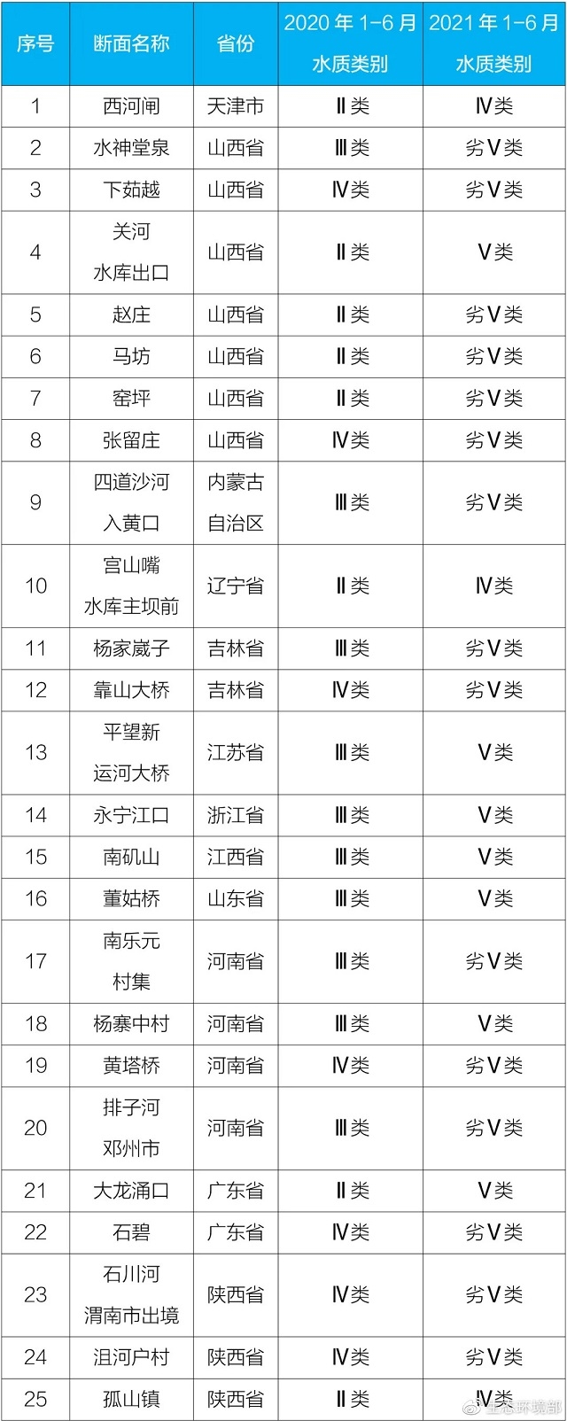 2021年上半年水質(zhì)明顯惡化斷面清單