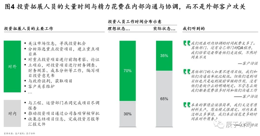 理想狀態(tài)下,對外對內(nèi)工作的時間分配比例應該是7:3,甚至更高也不為過,但現(xiàn)實往往相反,由于內(nèi)部協(xié)同效率不高、流程繁冗、“人治”問題嚴重,我們發(fā)現(xiàn)一些投資拓展人員更多的時間與精力花費在內(nèi)部溝通與協(xié)調(diào),而不是外部客戶攻關(guān)(見圖4)。造成這種現(xiàn)象的原因,表面看上去是內(nèi)部流程繁瑣,決策鏈條冗長,實則是內(nèi)部沒有形成一以貫之以市場為導向、以項目為核心的理念文化。平時大多只是喊喊口號而已,并未真正付諸行動。