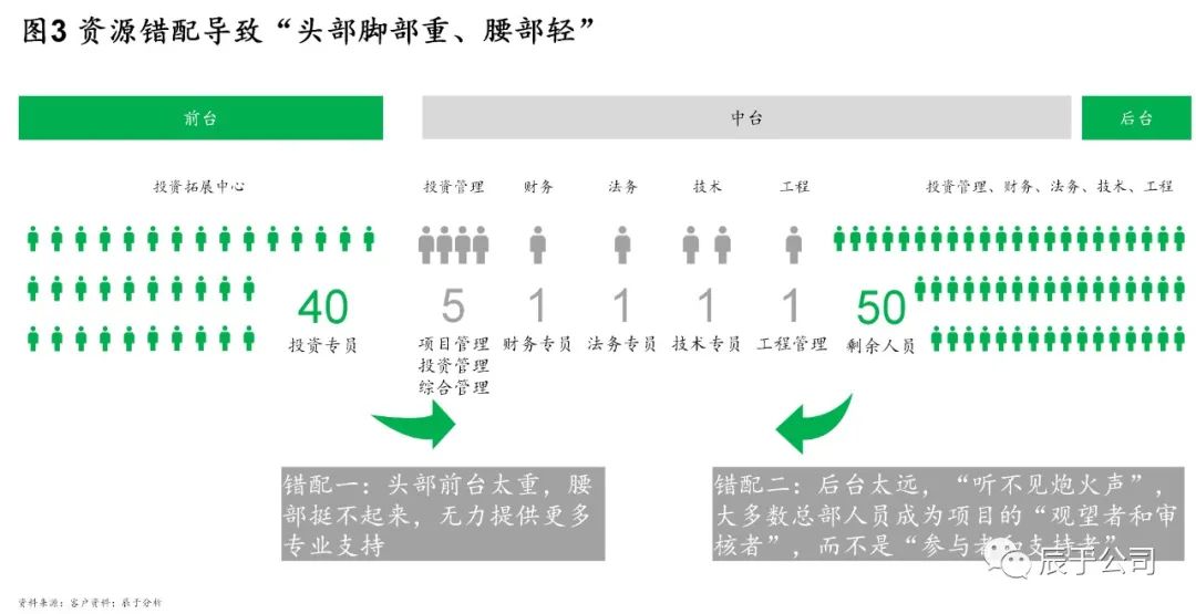 不難發(fā)現(xiàn),近年來一些企業(yè)開始“招兵買馬”,大量招聘投資拓展人員,這對于企業(yè)提高投資拓展能力自然是好事。不過我們也注意到,一些企業(yè)在投資相關(guān)的人員配置上卻不盡合理:他們通常把大量投資拓展人員“撒在前線”,同時建立“大后臺”,與投資相關(guān)的投管、財務、法務,甚至技術(shù)、工程、運營等人員主要負責項目質(zhì)量把關(guān)和風險管控,只有少量人員在中臺為前臺提供“彈藥”和支持(見圖3)。這種“頭重腳重”帶來兩個“錯配”,一是頭部前臺太重,腰部挺不起來,無力提供更多專業(yè)支持;二是腳部后臺太遠,“聽不見炮火聲”,大多數(shù)人成為項目的“觀望者和審核者”,而不是“參與者和支持者”。
