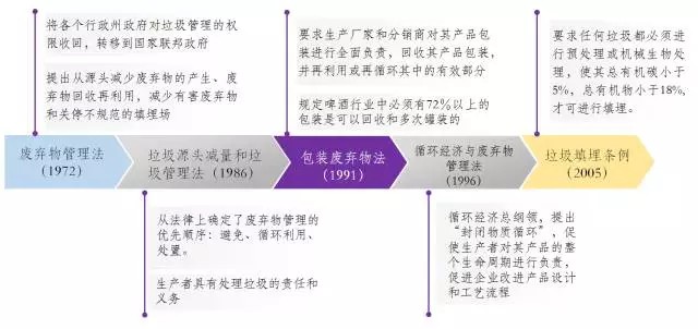 1991年頒布的《包裝廢棄物法》將包裝廢棄物的收集和處理責任從過去的各個行政州政府分攤給了各生產(chǎn)廠家、分銷商等企業(yè)機構(gòu),要求生產(chǎn)廠家和分銷商回收其產(chǎn)品包裝,并進行再利用,該法催生了德國著名的“二元回收系統(tǒng)”(即“綠點公司”),與公共環(huán)衛(wèi)回收系統(tǒng)平行運作。