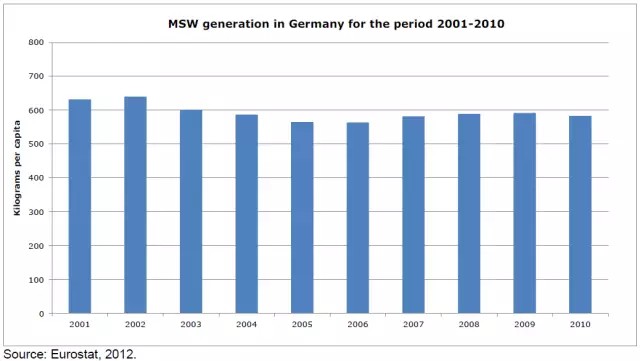 根據(jù)歐洲統(tǒng)計局的數(shù)據(jù),從2001年至2010年,德國的城市生活垃圾總產(chǎn)生量在5000萬噸左右浮動,但是人均垃圾產(chǎn)生量有所下降,從2001年的632kg/a(1.73kg/d)減少到2006年的564kg/a(1.55kg/d)。