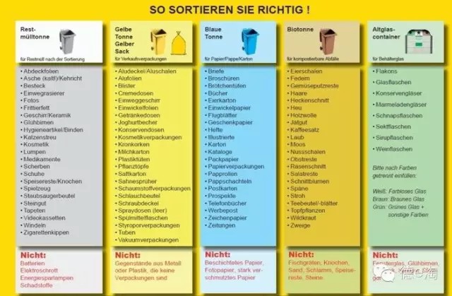 德國生活垃圾分類多采用“五分法”,即將生活垃圾分為以下五大類分別扔入不同顏色垃圾桶:棕色桶裝有機垃圾(包括剩飯剩菜、果皮骨頭等廚余垃圾,庭院綠化垃圾);黃色桶(或袋)裝輕型包裝(如塑料袋,包裝盒,牛奶盒等);藍色桶收集廢紙與廢紙箱;廢玻璃經(jīng)過分類后分別投入棕色、白色、綠色三種顏色的垃圾桶;剩余黑色或灰色的桶,用來收集所有居民分到無法再分的剩余垃圾。