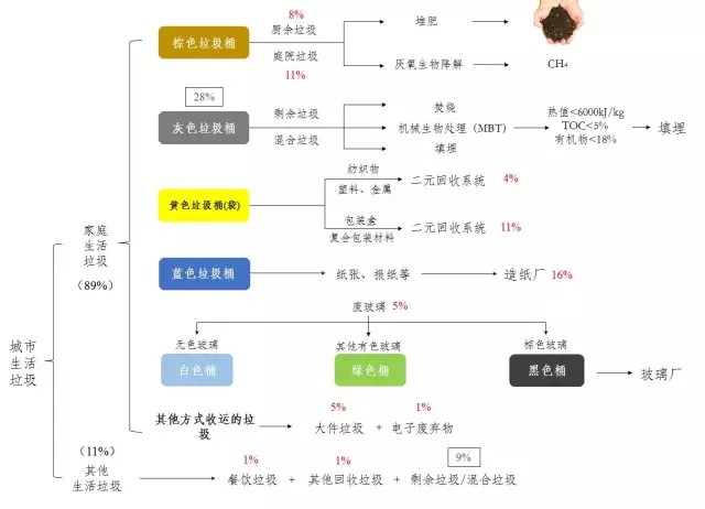 按照后續(xù)處理方式,生活垃圾又可分為分類收集的垃圾和剩余垃圾兩類。分類收集的垃圾包括廢紙、有機垃圾(殘余果蔬、園林垃圾等)、玻璃(分為棕色、綠色、白色)、輕質(zhì)包裝廢棄物、大件垃圾(廢舊家具)及廢舊金屬、廢舊電池等多種類型。剩余垃圾則是其它不可回收的殘余廢棄物。