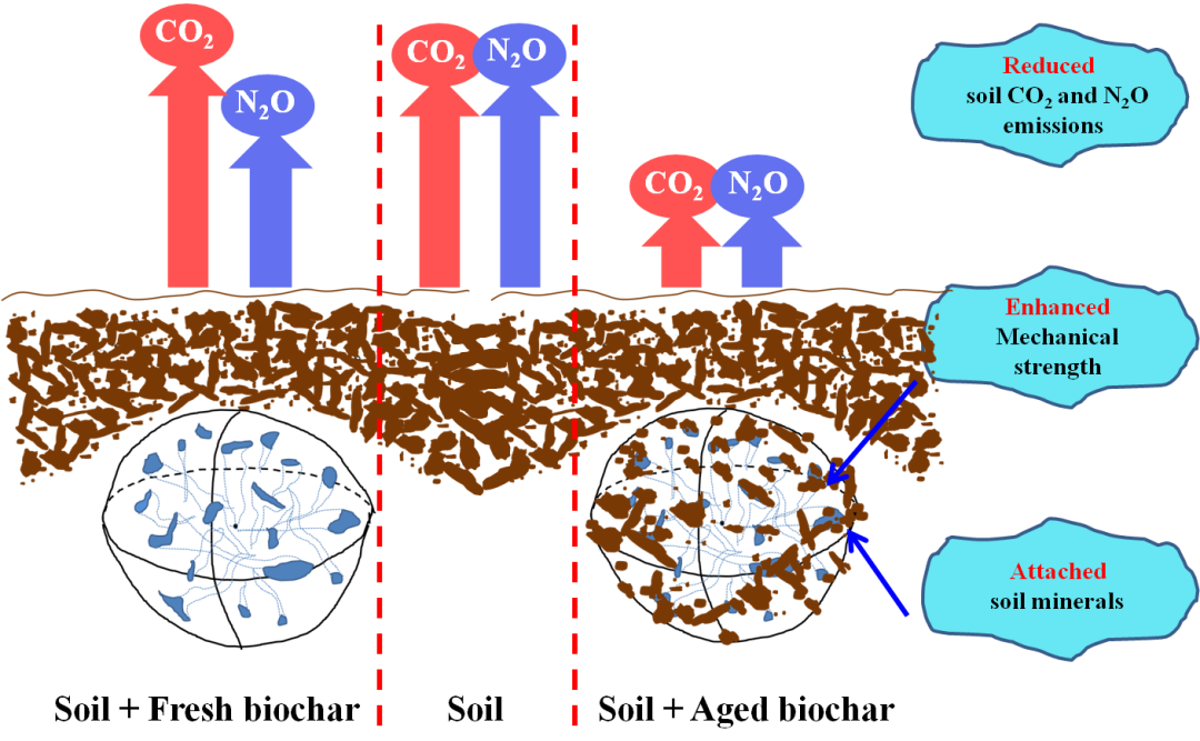 田間老化使生物炭表面積累礦物質,形成有機-礦物復合體,從而增強顆粒物理穩(wěn)定性(如機械強度),顯著減少土壤CO2和N2O排放。因此新鮮生物炭使用之前,通過人為或自然的方法去除不穩(wěn)定組分及構建富含有機-礦物復合體的保護界面,對于增強其在土壤中固碳減排潛力具有重要意義。
