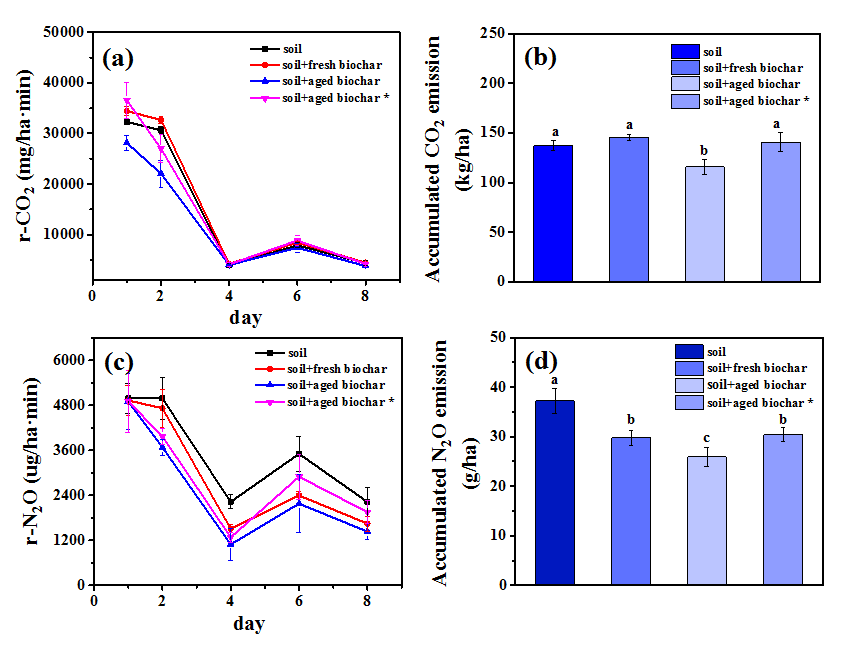 Fresh biochar had no significant impact on soil CO2 emissions, and significantly reduced soil accumulated N2O emissions; aged biochar further significantly reduced soil CO2 and N2O emissions (P<0.05); after scraping off the surface material of aged biochar, the soil CO2 emission reduction effect of aged biochar has disappeared while the soil N2O emission reduction effect was weakened. The results indicated that the surface material of the aged biochar (containing more organic-mineral complexes) played an important role in reducing soil CO2 and N2O emissions.圖5. 土壤CO2或N2O排放速率或累積排放量
