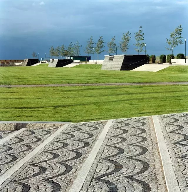 Dania濱海公園位于瑞典和丹麥分界處的?resund海峽一側(cè)。該公園是原馬爾默海岸西部港口改造工程的主要項(xiàng)目之一,也是瑞典國(guó)內(nèi)對(duì)城市用地進(jìn)行開發(fā)再利用的最為雄心勃勃的項(xiàng)目之一。該用地曾經(jīng)是寸草不生的垃圾填埋場(chǎng);是一片充斥著臟污不堪的淤泥的工業(yè)荒漠。起初,難以定義的基地條件給設(shè)計(jì)師帶來了不小的困難,最終那些自然的瞬息萬變的元素反而構(gòu)成了設(shè)計(jì)的主角:光、風(fēng)、大海、地面線以及一望無際的遠(yuǎn)景。這是一片隨季節(jié)和氣候變化的場(chǎng)所,人們?cè)谶@里可以體驗(yàn)巖石的堅(jiān)硬與海浪的兇悍,體驗(yàn)落日的壯美與夏日的明媚。公園最重要的組成要素是被稱為“Scouts(瞭望臺(tái))”的部分:三個(gè)傾斜的混凝土臺(tái),嵌入到巖石組成的海岸線中,讓來到公園的人們可以深入大海。40X40m的被稱為“堡壘”的平臺(tái),比海平面高6m,無論是強(qiáng)烈的海風(fēng)還是壯美的落日,只要站在這里都能暢快地體驗(yàn)。此外,三個(gè)木箱組成的“陽臺(tái)”提供了俯瞰廣闊草坪的場(chǎng)所。后者是一塊絕佳的室外活動(dòng)場(chǎng)地,兩排高地錯(cuò)落的樹木及耐鹽灌木將強(qiáng)烈的海風(fēng)阻隔在外。
