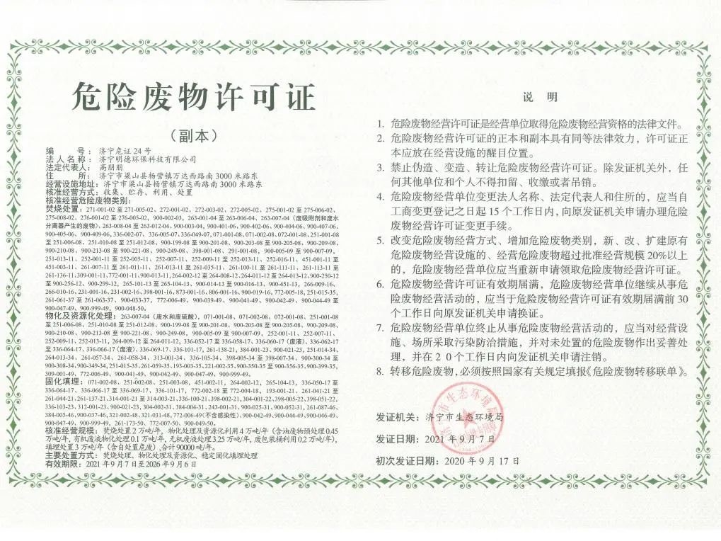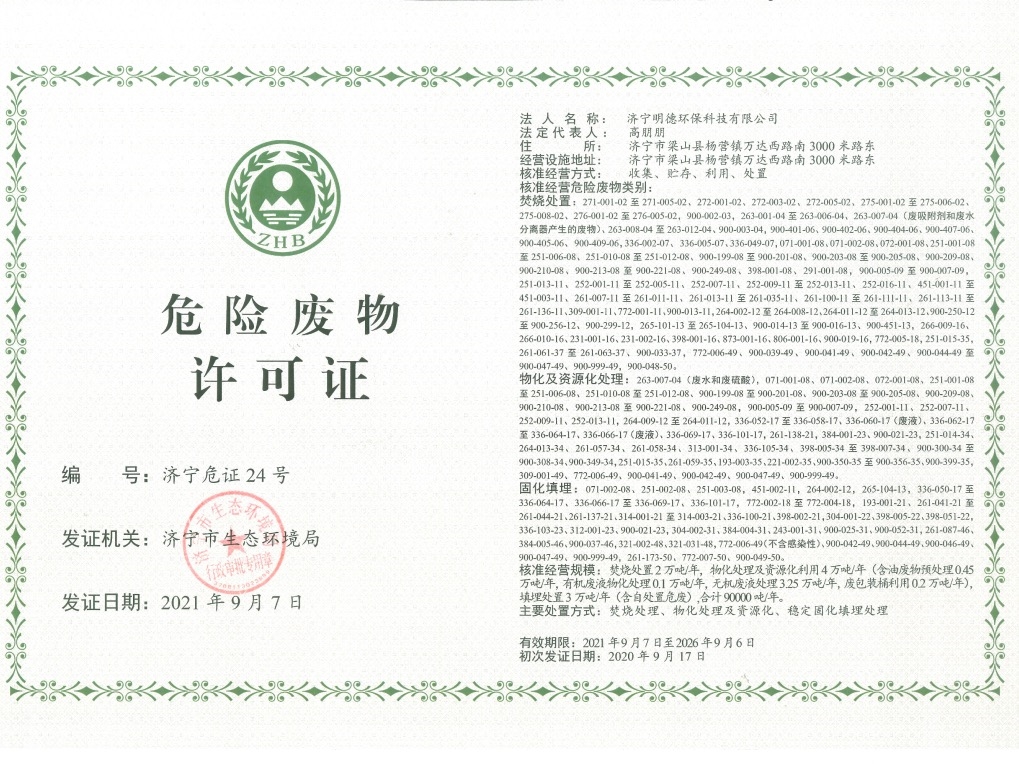 9月10日,雅居樂環(huán)保集團旗下濟寧明德環(huán)??萍加邢薰?以下簡稱“濟寧明德項目”)喜獲濟寧市生態(tài)環(huán)境局頒發(fā)的5年期《危險廢物許可證》。這也是當?shù)貎H有的兩張5年期《危險廢物許可證》之一。
