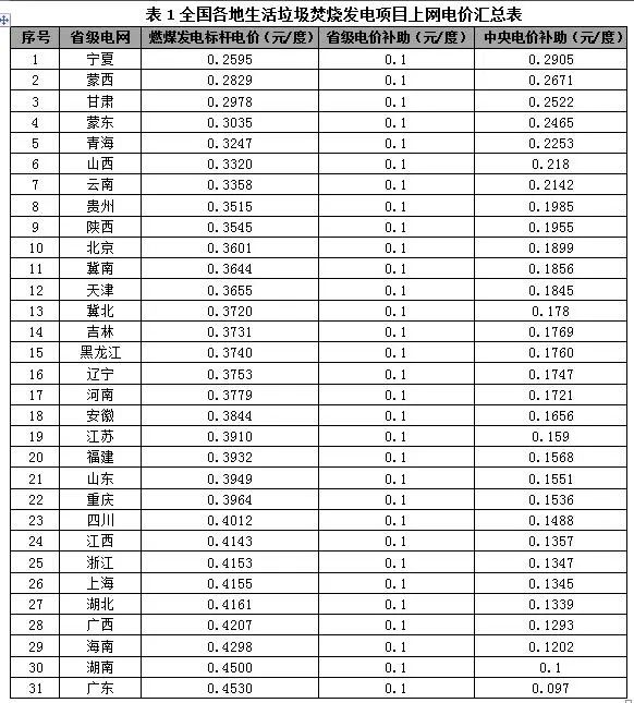 鑒于全國各地區(qū)生活垃圾焚燒發(fā)電項目上網(wǎng)電價現(xiàn)狀,分述如下:
