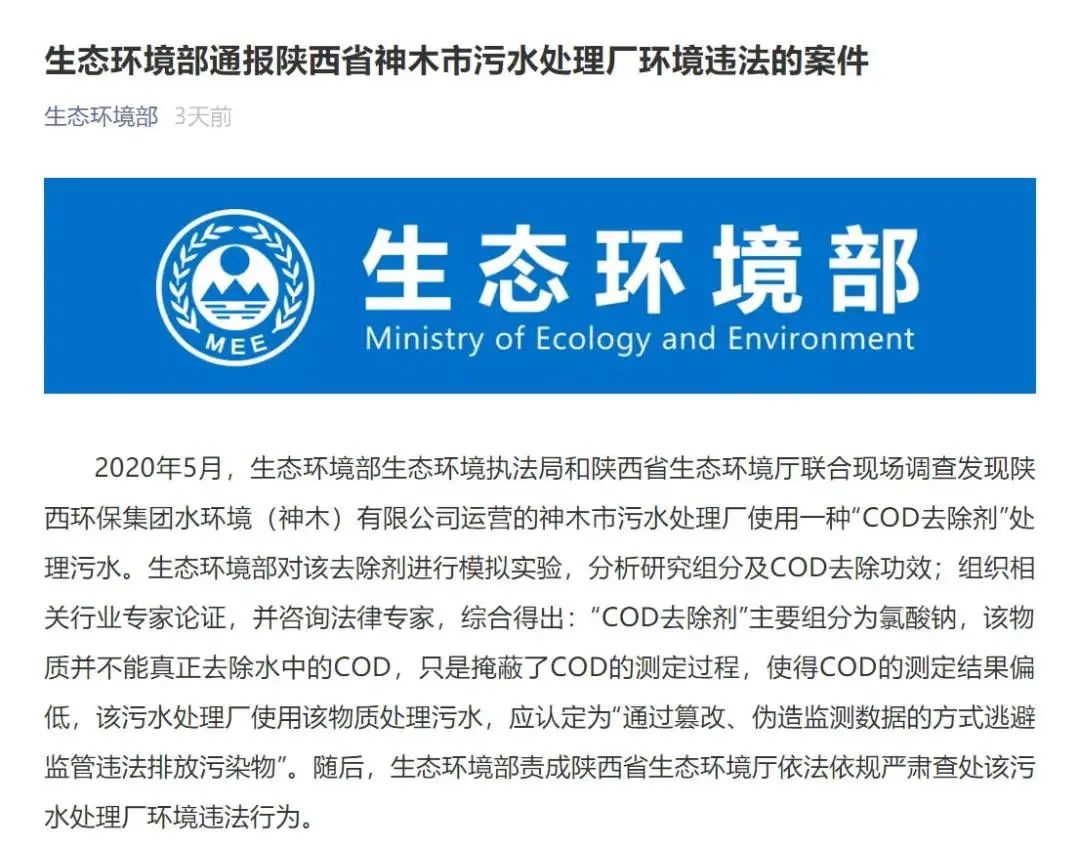 3、生態(tài)環(huán)境部通報(bào)陜西神木市污水處理廠使用“COD去除劑”環(huán)境違法案件,生態(tài)環(huán)境部,2021-01-23