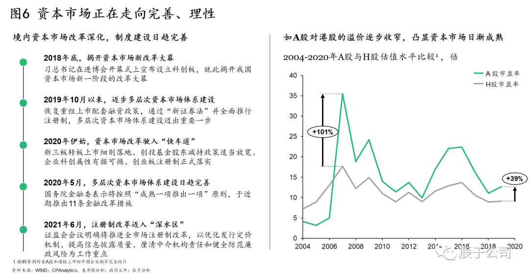 政策推動下,國內(nèi)資本市場改革逐步深化,制度建設(shè)日趨完善,生態(tài)環(huán)保企業(yè)面臨的資本市場大環(huán)境正走向理性。A股對H股的溢價逐步收窄便是其中一佐證:基于對95家同時在A股和港股上市的企業(yè)的分析,可以看到相比于2006年最高峰時A股對H股超過100%的溢價,當(dāng)前30%-40%的溢價已有明顯收窄(見圖6)。