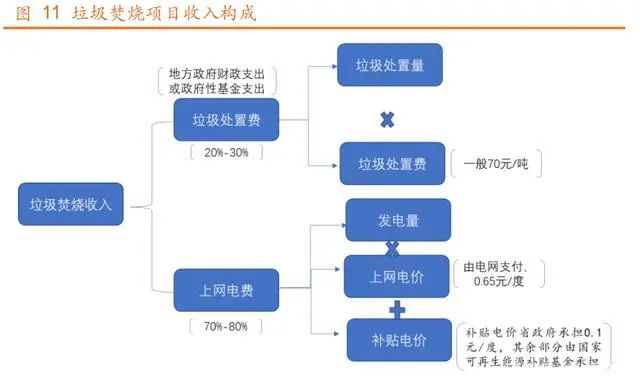 垃圾焚燒運(yùn)營(yíng)收入主要來(lái)自于上網(wǎng)電費(fèi)(向電網(wǎng)收?。┖屠幚碣M(fèi)(向政府收取),上網(wǎng)電費(fèi)一般占比 70%~80%,垃圾處理費(fèi)一般占比 20%~30%。