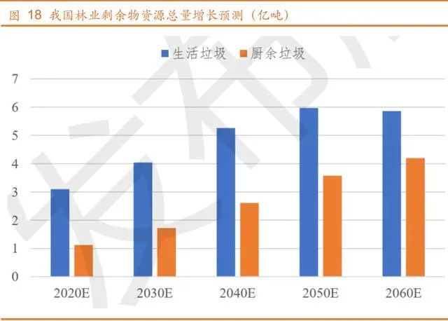 根據(jù)國(guó)家林草局發(fā)布的《中國(guó)林業(yè)和草原統(tǒng)計(jì)年鑒》數(shù)據(jù),目前我國(guó)林 業(yè)面積約為17988.85萬(wàn)公頃,森林覆蓋率達(dá)到22.96%,年采伐木材10045.85 萬(wàn)立方米,由此測(cè)算出林業(yè)廢棄物資源量約為 3.5 億噸。林業(yè)碳匯是最為重 要的固碳手段,預(yù)計(jì)未來(lái)我國(guó)林業(yè)面積將會(huì)保持穩(wěn)定增長(zhǎng)。根據(jù)近 20 年《中 國(guó)林業(yè)和草原統(tǒng)計(jì)年鑒》數(shù)據(jù)分析,林業(yè)采伐總資源量保持 2%的增長(zhǎng),預(yù)計(jì) 未來(lái)林業(yè)剩余物資源量也將隨之持續(xù)增加。預(yù)計(jì) 2030 年林業(yè)剩余物總量將達(dá) 到 4.27 億噸,到 2060 年,林業(yè)剩余物總量將達(dá)到 7.73 億噸。