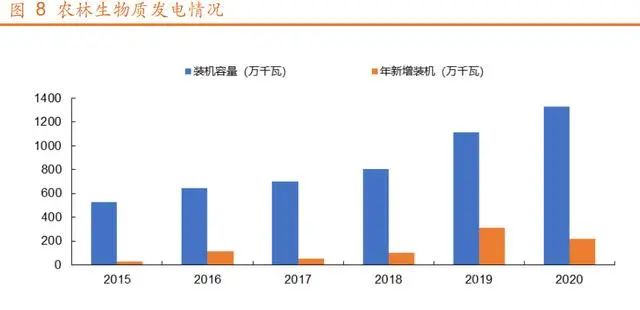 農(nóng)林生物質(zhì)發(fā)電項(xiàng)目利用小時(shí)數(shù)從 2018 年開(kāi)始逐年走低,主要原因是可再生能源補(bǔ)貼拖欠對(duì)農(nóng)林生物質(zhì)發(fā)電項(xiàng)目影響較大。根據(jù)統(tǒng)計(jì),2019 年農(nóng)林生物質(zhì)發(fā)電利用小時(shí)數(shù)超過(guò) 5000h 的項(xiàng)目為188 個(gè),總裝機(jī)為 526 萬(wàn)千瓦。據(jù)此判斷約 50%的項(xiàng)目在承受電價(jià)補(bǔ)貼拖欠的壓力下,仍堅(jiān)持項(xiàng)目運(yùn)營(yíng)。2020 年農(nóng)林生物質(zhì)發(fā)電新增裝機(jī)容量也有所下降,為 217 萬(wàn)千瓦。