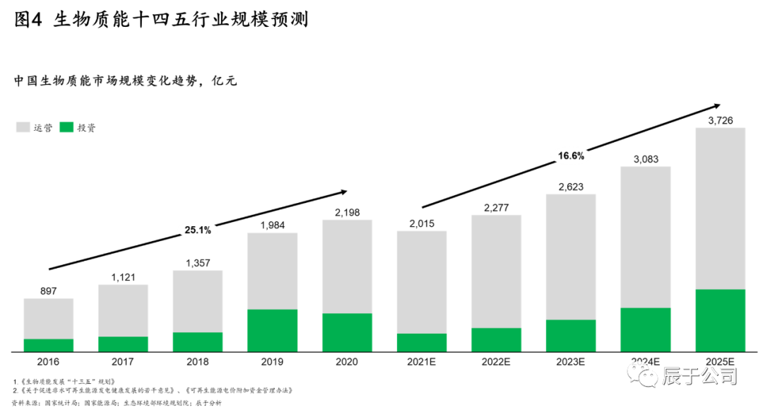 辰于預(yù)測,隨著“30·60”雙碳目標(biāo)引導(dǎo)下的能源革命和能源轉(zhuǎn)型,以及相關(guān)政策支持(例如明確對存量、增量的生物質(zhì)發(fā)電項(xiàng)目將按照新增不欠的原則由國家繼續(xù)給予電價(jià)補(bǔ)貼,并鼓勵金融機(jī)構(gòu)按照市場化原則對列入補(bǔ)助項(xiàng)目清單的企業(yè)予以支持),生物質(zhì)能市場“十四五”期間的投資和運(yùn)營規(guī)模將持續(xù)提升,復(fù)合增長率16.6%,到2025年達(dá)到3700億元規(guī)模(見圖4)。投資方面,預(yù)計(jì)生物天然氣投資額最高,增長也最快;運(yùn)營方面,生物質(zhì)發(fā)電占比最高,但生物天然氣的增速最快。
