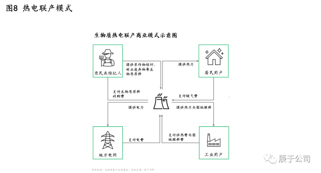 盈利壓力一方面將促進(jìn)行業(yè)洗牌,在優(yōu)勝劣汰的過程中預(yù)計(jì)行業(yè)集中度將逐步提升,民營企業(yè)的份額會逐步降低;另一方面,行業(yè)也在積極探索新的商業(yè)模式,提升項(xiàng)目盈利性,其中熱電聯(lián)產(chǎn)是主要的方向(見圖8)。相比單純發(fā)電賣錢,熱電聯(lián)產(chǎn)在發(fā)電過程中產(chǎn)生的剩余熱量也通過向居民或工業(yè)用戶供熱的方式來獲取收入,能量利用率得到提升,經(jīng)濟(jì)效益和社會效益都更好。