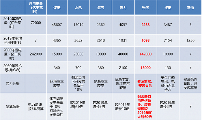 光伏:預(yù)計(jì)到2060年,光伏年發(fā)電量較2019年擴(kuò)大超過(guò)60倍,達(dá)到14.2萬(wàn)億千瓦時(shí)。無(wú)論從資源豐度、降本空間還是施工環(huán)境要求角度出發(fā),光伏在“零碳能源”中都具備突出比較優(yōu)勢(shì)。不出意外,將擔(dān)當(dāng)中國(guó)能源轉(zhuǎn)型的“一號(hào)位”,剩余電力缺口也將由光伏發(fā)電彌補(bǔ)。