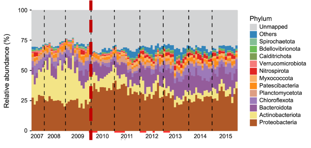 香港大學(xué)張彤教授的團隊在2007年6月到2015年 12月期間,每個月都會在香港沙田污水處理廠采集活性污泥的樣本。他們想看看,復(fù)雜的活性污泥微生物群落,在這么長的時間跨度內(nèi),在經(jīng)歷各種環(huán)境條件的變動時,這個系統(tǒng)是怎么演變的。