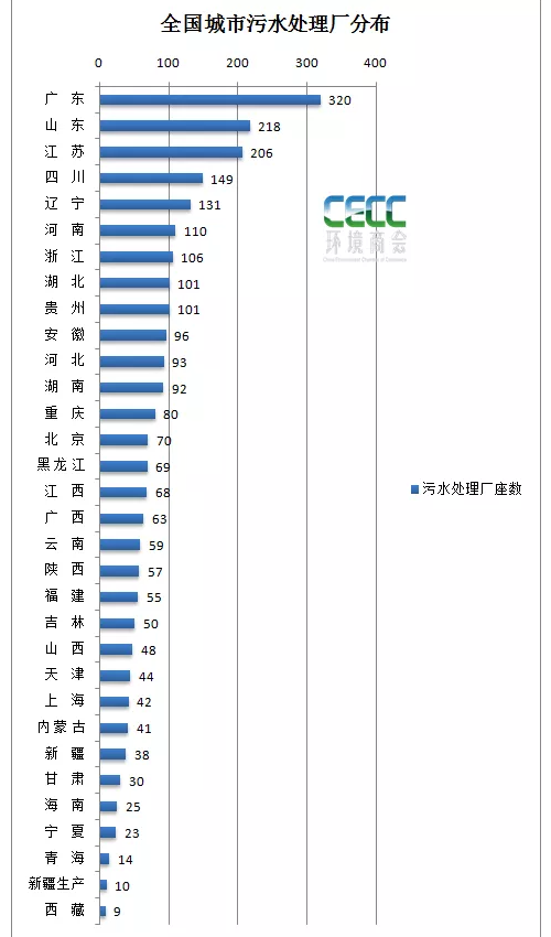 截至2020年,全國城市污水處理能力分布(按照各省市污水處理廠數(shù)量排序):