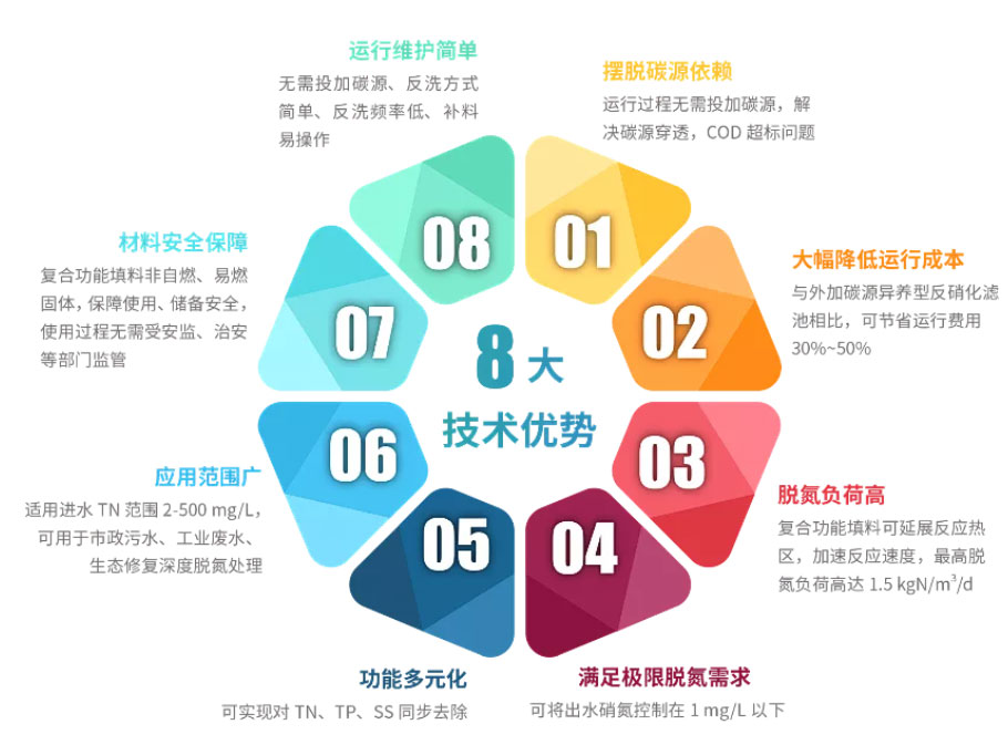 而通過(guò)對(duì)復(fù)合活性生物載體中硫、鐵及其他活性組分進(jìn)行優(yōu)化設(shè)計(jì),則能促使附著其上的功能微生物形成代謝偶聯(lián)網(wǎng)絡(luò),實(shí)現(xiàn)高生物持有量、長(zhǎng)距離電子傳遞,進(jìn)而獲得高負(fù)荷脫氮能力,徹底擺脫對(duì)碳的依賴(lài)。▼SADeN®技術(shù)8大核心優(yōu)勢(shì)