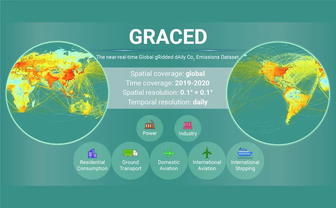 本研究提出了一種基于近實時碳排放量化方法和參數(shù)模型的碳排放空間表征模式,基于衛(wèi)星遙感數(shù)據(jù)、地面監(jiān)測數(shù)據(jù)與統(tǒng)計數(shù)據(jù)等多源數(shù)據(jù)耦合的云計算平臺,以高時空精度(天尺度,0.1度柵格)和高時效(近實時更新:僅滯后約一個月)方式進行全球碳排放空間量化展示,構(gòu)建以天為單位的(自2019年1月1日起)全球首個近實時天尺度碳排放地圖—Global gRidded dAily CO2 Emissions Dataset(GRACED),為全球碳排放動態(tài)監(jiān)測及政策評估提供了重要的數(shù)據(jù)支撐。