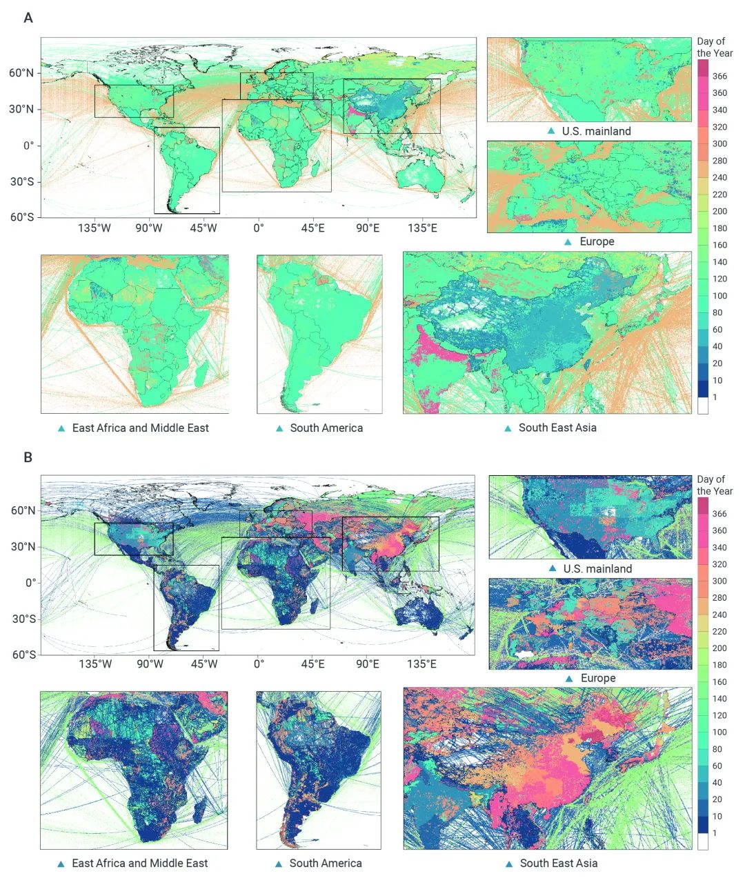 GRACED反映了全球不同區(qū)域受疫情影響排放大幅下降時間和后期經(jīng)濟復(fù)蘇排放顯著反彈時間的差異(圖6)。圖6A展示了全球不同區(qū)域最大碳排放降幅日的碳地圖,圖6B展示了最大反彈日的碳地圖。顏色越紅表明出現(xiàn)時間越晚。