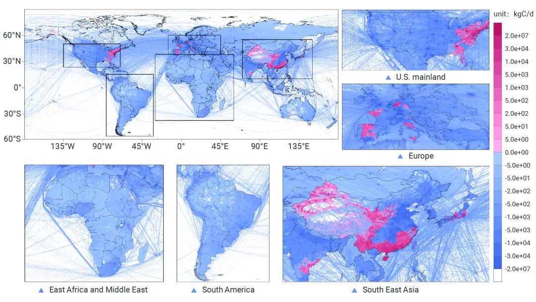 ▲圖3展示了全球四大重點排放區(qū)域的碳排放實時動態(tài)變化(A.東亞地區(qū),B.美國主體,C.歐洲,D.南亞)