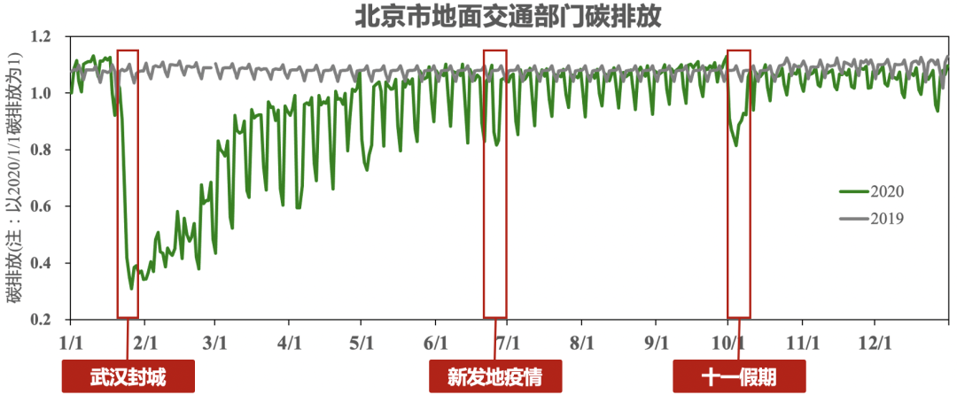▲圖8展示了2020年北京市地面交通部門日排放波動情況示意圖