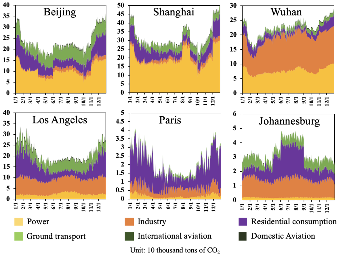 GRACED覆蓋了全球重點城市在內(nèi)的關(guān)鍵排放區(qū)域,并量化表征分部門排放的時空動態(tài)特征。數(shù)據(jù)顯示,2020年中國的北京、上海、武漢城市的碳排放量在1月末首先受疫情沖擊,出現(xiàn)明顯下降,但在疫情得到控制后趨于平穩(wěn)。而洛杉磯、巴黎、約翰內(nèi)斯堡受疫情沖擊相對較晚,在4、5月份才出現(xiàn)排放顯著下降(圖7)。