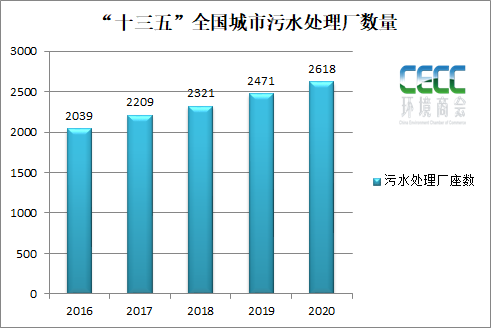 截至2020年,城市及縣城污水處理廠共4326座,較“十二五”末新增783座,其中,城市污水處理廠2618座,五年累計新增674座。污水廠處理能力19267萬立方米/日,較“十二五”末增長37.2%。