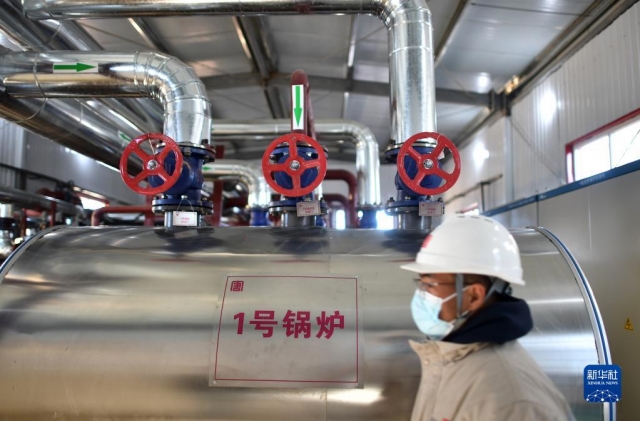 11月25日,大唐青海能源開(kāi)發(fā)有限公司一名工人在青海省海南藏族自治州興??h民族高級(jí)中學(xué)鍋爐房?jī)?nèi)巡檢。新華社記者 駱曉飛 攝