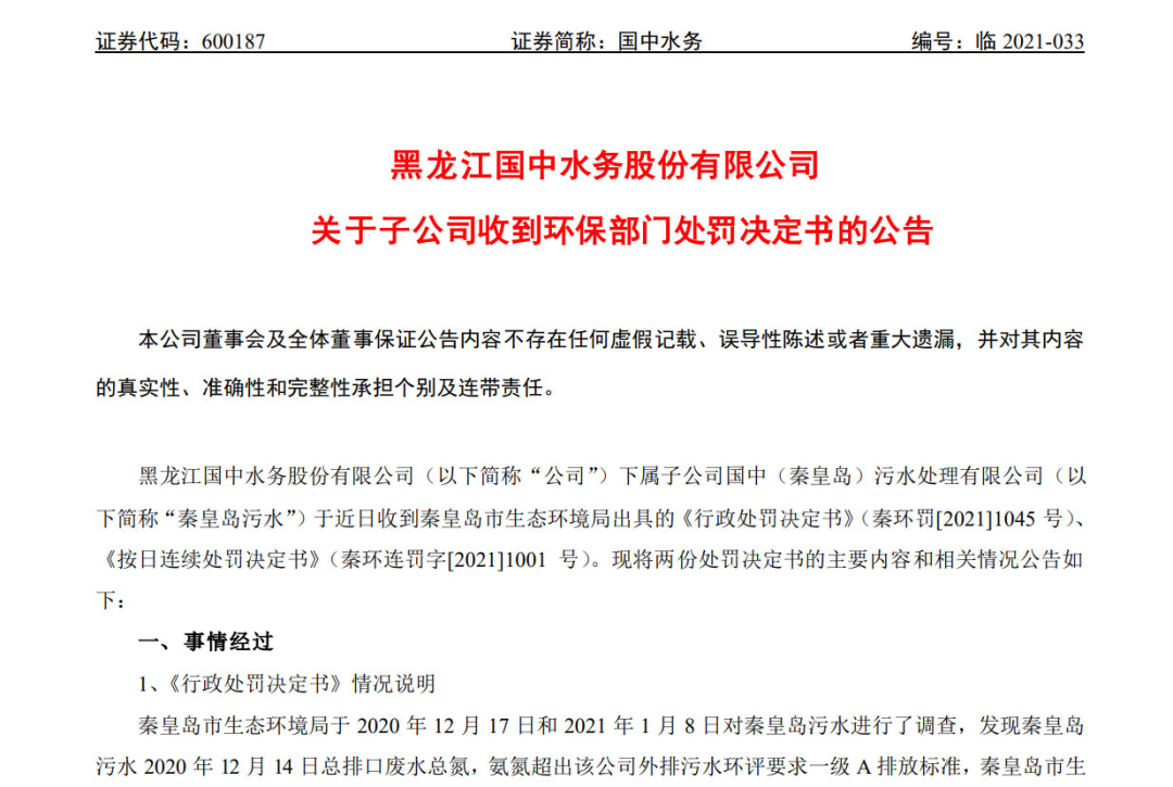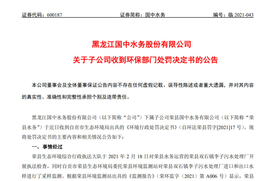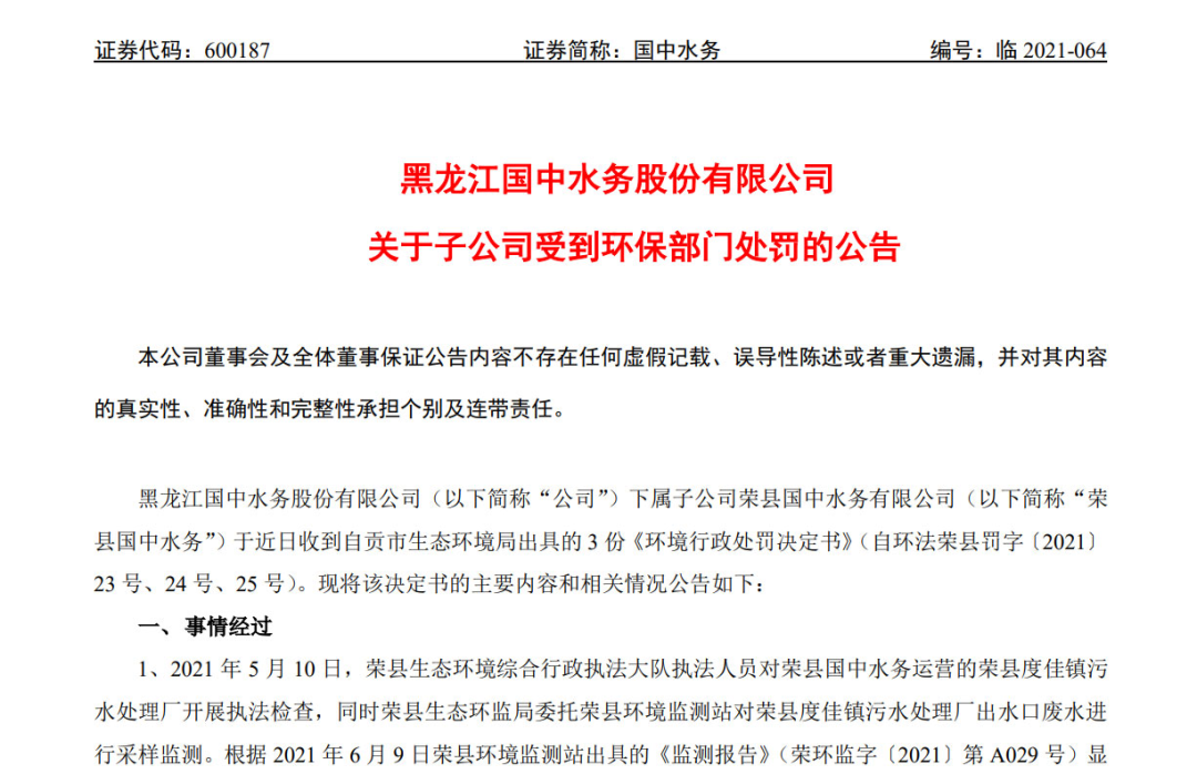 11月25日,國中水務(wù)(600187.SH)發(fā)布公告稱,其下屬子公司榮縣國中水務(wù)有限公司(下稱“榮縣國中水務(wù)”)因為“進水超標導(dǎo)致的出水超標及執(zhí)行標準認定問題”,被罰共計85.70萬元。