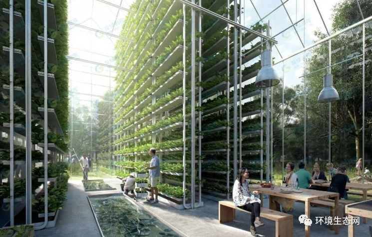 國(guó)外已經(jīng)開展了大量研究,綠色建筑的高級(jí)階段可以發(fā)展為 " 魚菜共生 " 系統(tǒng),使日常食物能夠在建筑內(nèi)實(shí)現(xiàn)并就近供應(yīng)。魚菜共生是一種新型的復(fù)合生態(tài)體系,它把水產(chǎn)養(yǎng)殖與水耕栽培兩種原本完全不同的農(nóng)耕技術(shù),通過巧妙的生態(tài)系統(tǒng)設(shè)計(jì),達(dá)到在建筑內(nèi)科學(xué)的協(xié)同共生,從而實(shí)現(xiàn)養(yǎng)魚不換水而無水質(zhì)憂患,種菜不施肥而正常成長(zhǎng)的生態(tài)共生效應(yīng)。采取 24 小時(shí)燈光照射促進(jìn)蔬菜生長(zhǎng),而且水的利用率可以達(dá)到 90% 以上。在這個(gè)案例中,樓頂單位面積的蔬菜產(chǎn)量是大田里的 50 倍左右,非常高效,很值得中國(guó)以城市為主導(dǎo)的 " 碳中和 " 體系學(xué)習(xí)。