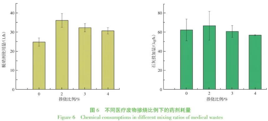 由圖4可以看出,生活垃圾日常運(yùn)行熱處理焚燒煙氣中CO本身含量較低,平均為1.72 mg/m3,遠(yuǎn)低于排放標(biāo)準(zhǔn)的限值。摻燒醫(yī)療廢物后煙氣中CO含量顯著升高,當(dāng)摻燒比例為3%時(shí),CO平均含量達(dá)13.78 mg/m3,是日常運(yùn)行工況下的8倍,但是仍然遠(yuǎn)低于標(biāo)準(zhǔn)值,其上偏差雖然有7.33 mg/m3,但是仍低于排放限值。2%和4%的摻燒比例下,煙氣中CO的含量增加,分別是日常運(yùn)行條件下的3.8倍和2.2倍,但是明顯低于摻燒比例為3%的工況。顯著性分析發(fā)現(xiàn)P<0.05,說(shuō)明摻燒醫(yī)療廢物對(duì)焚燒煙氣中CO含量有明顯影響,且呈現(xiàn)增加的趨勢(shì)。這是因?yàn)獒t(yī)療廢物的熱值偏高,即使在供風(fēng)相應(yīng)地調(diào)整前提下,可能會(huì)因?yàn)榫植繜嶝?fù)荷高、在高溫區(qū)停留時(shí)間縮短而引起CO升高。 醫(yī)療廢物的Cl典型含量為1.1%~2.1%,而生活垃圾在0.2%~0.8%的水平。但是表2中數(shù)據(jù)顯示醫(yī)療廢物的Cl含量雖然偏高,但是未達(dá)到上述水平,這可能與醫(yī)療廢物的來(lái)源及取樣有關(guān)。由圖5可以看出,日常運(yùn)行焚燒煙氣中HCl平均含量為3.32 mg/m3,在生活垃圾中摻燒醫(yī)療廢物后煙氣中HCl含量略有降低,這可能是因?yàn)檫M(jìn)料波動(dòng)引起的。在2%摻燒比例下煙氣中HCl含量變化不大,僅為3.30 mg/m3,基本與日常運(yùn)行條件下的含量持平,但是石灰投加量有所增加,如圖6所示。摻燒比例為3%和4%時(shí),HCl濃度反而降低明顯,對(duì)應(yīng)地石灰的消耗量也有所降低,這可能與生活垃圾的組分波動(dòng)有關(guān),因?yàn)閾綗囼?yàn)時(shí)間長(zhǎng)達(dá)8 d,生活垃圾組分和醫(yī)療廢物組分均可能出現(xiàn)變化,也說(shuō)明垃圾組分本身的波動(dòng)可能掩蓋小比例的醫(yī)療廢物摻燒的影響。