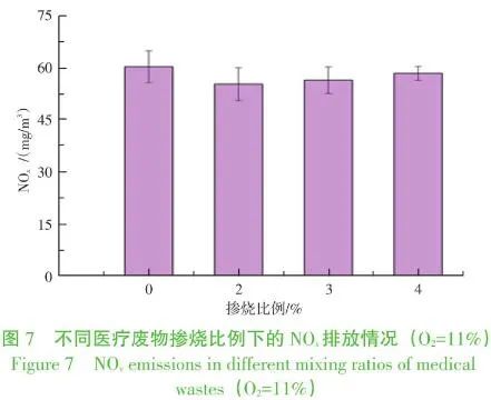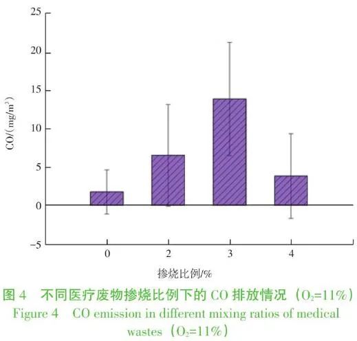 爐渣主要用于建筑材料,摻燒4%及以下的醫(yī)療廢物,從重金屬的浸出來(lái)看基本上不影響其用途。因此巴塞爾公約也推薦醫(yī)療廢物可在生活垃圾焚燒爐中應(yīng)急處置。 不同醫(yī)療廢物摻燒比例下CO排放情況見(jiàn)圖4。