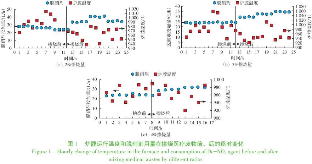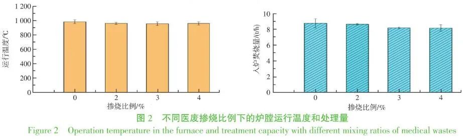 這里主要關(guān)注醫(yī)療廢物摻燒對(duì)焚燒爐爐膛溫度和焚燒處理量的影響。圖1給出每個(gè)摻燒比例前后的爐膛溫度和脫硝劑用量的逐時(shí)變化。其中摻燒比例為2%和3%(wt)時(shí),前12 h為日常運(yùn)行情況,后12 h為摻燒后的代表性工況;摻燒比例為4%(wt)時(shí),前8 h為日常運(yùn)行情況,后8 h為摻燒后的代表性工況。將上述逐時(shí)溫度按照不同醫(yī)療廢物添加量工況取平均值,結(jié)果見(jiàn)圖2,圖2同時(shí)給出了實(shí)際的入爐垃圾焚燒量??梢?jiàn),日常運(yùn)行爐膛內(nèi)溫度較高,平均可達(dá)982.72 ℃,在摻燒醫(yī)療廢物后爐膛溫度略有降低,這可能是由于供風(fēng)量隨著醫(yī)療廢物摻燒比例的增加而增大引起的變化,但是不同摻燒比例下運(yùn)行溫度變化不大,無(wú)顯著性差異,總體上運(yùn)行溫度在正常波動(dòng)范圍內(nèi),并高于850 ℃。