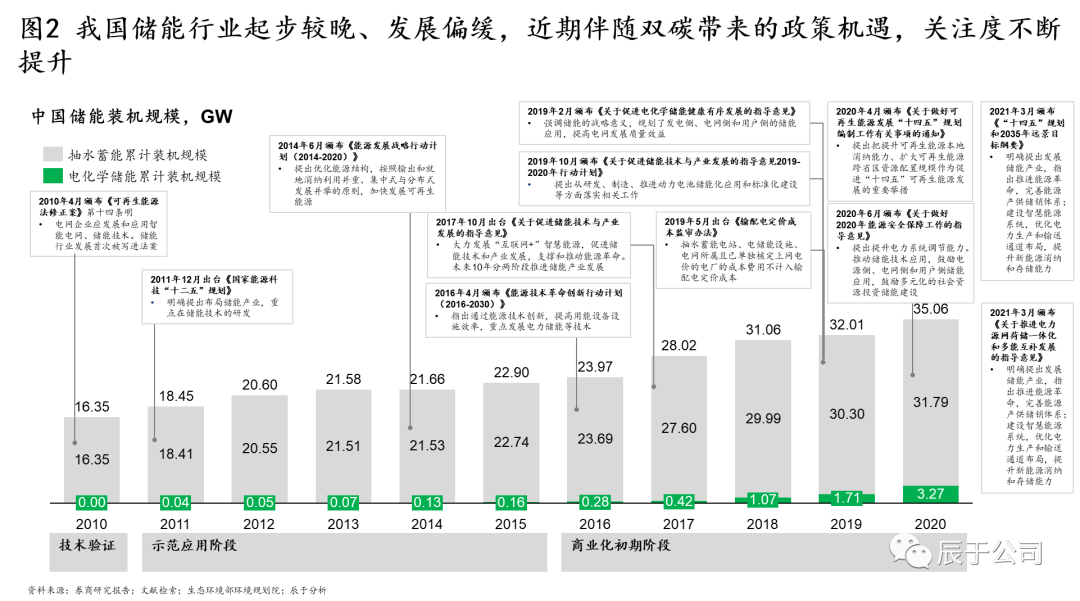 我國(guó)在儲(chǔ)能產(chǎn)業(yè)的戰(zhàn)略布局開始于2005年出臺(tái)的《可再生能源發(fā)展指導(dǎo)目錄》。經(jīng)過(guò)十多年的發(fā)展,目前儲(chǔ)能方面的政策已日趨完善,儲(chǔ)能發(fā)展已從研發(fā)示范向規(guī)?;?、市場(chǎng)化應(yīng)用轉(zhuǎn)變。