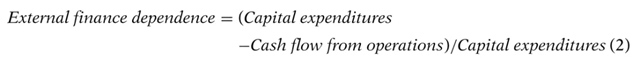 為了衡量企業(yè)能夠在多大程度上自行籌集資金,作者按照Whited(2006)和Duchin, Ozbas和Sensoy(2010)的方法構建了如下指標,如式(3)所定義。作者進一步將企業(yè)劃分為現(xiàn)金流流動性強弱劃分:如果企業(yè)的指數(shù)高于中位數(shù),則被劃分為高流動性,否則被劃分為低流動性。