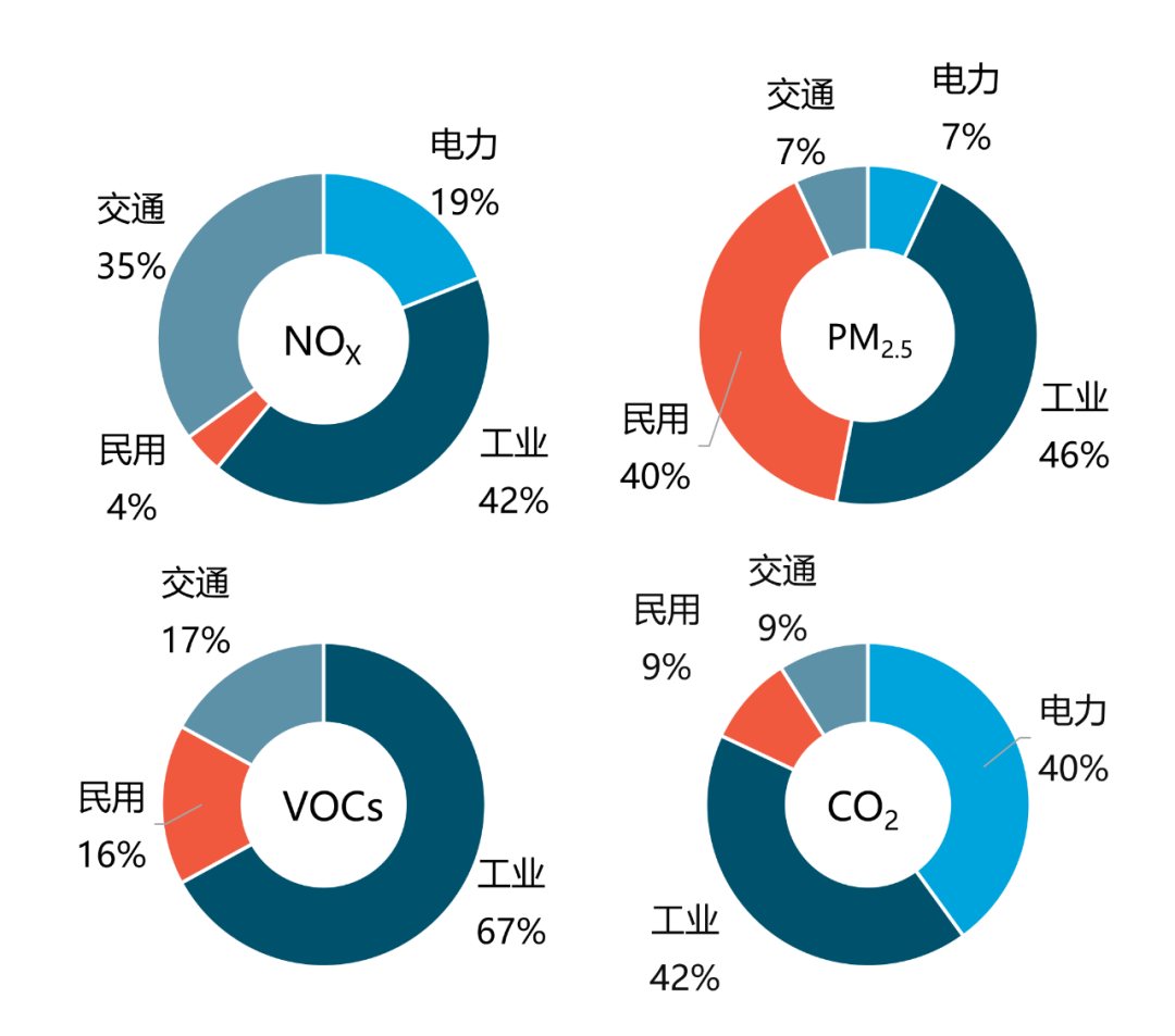 數(shù)據(jù)來源:污染物清單來自清華大學(xué) MEIC 清單結(jié)果 [6],CO2 排放數(shù)據(jù)來自生態(tài)環(huán)境部環(huán)境規(guī)劃院碳情速報研究結(jié)果 [19]